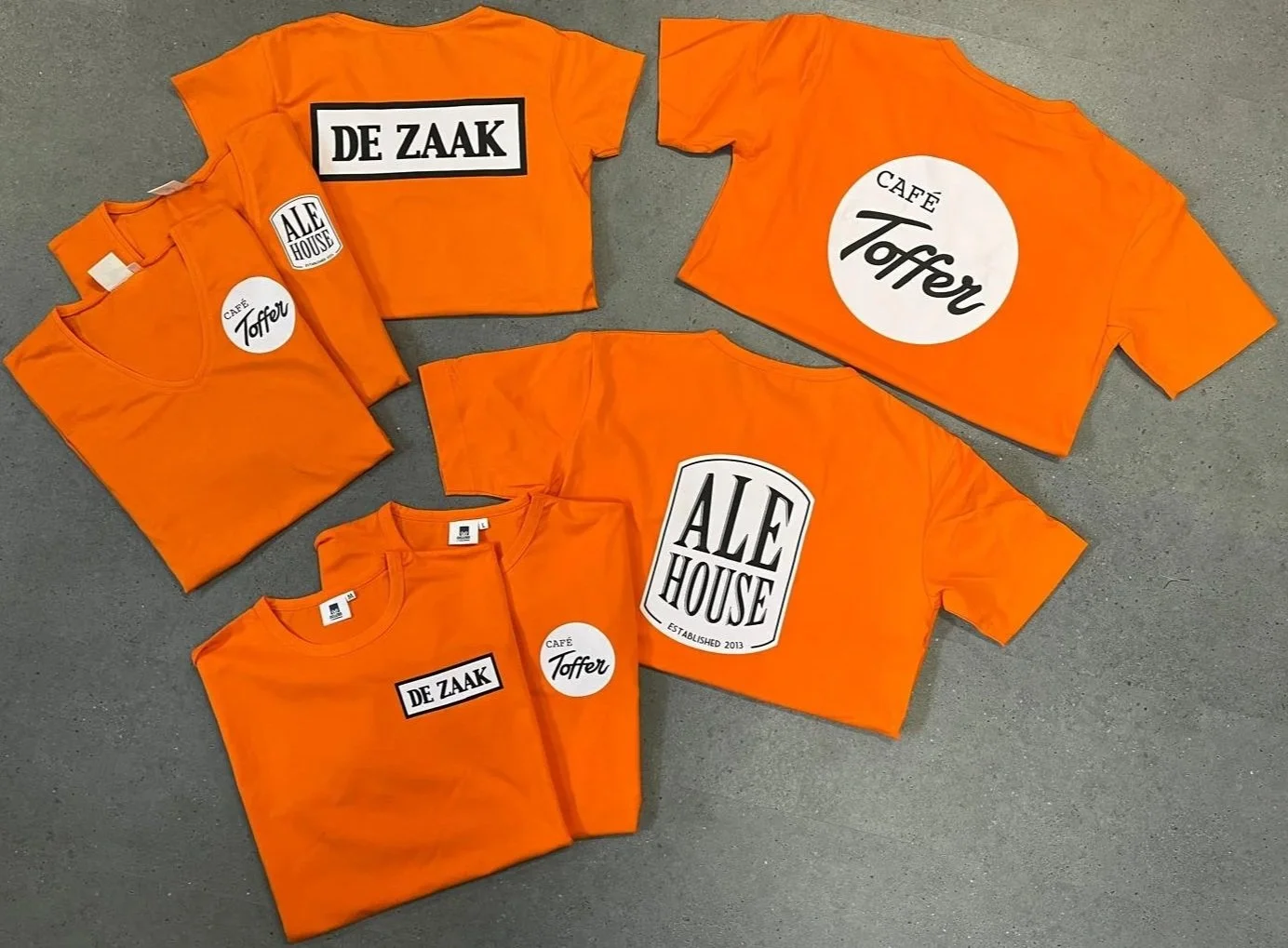 T-shirts voorzien van bedrukte logo’s op de borst en op de rug.